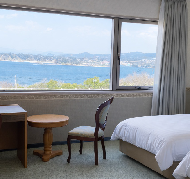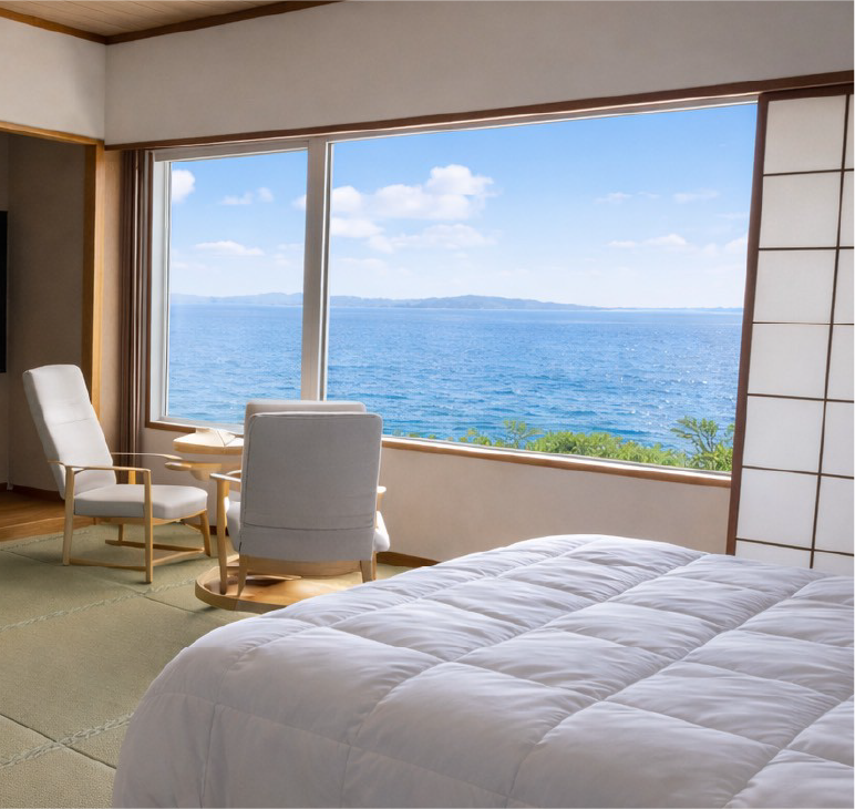 全室オーシャンビューの客室で過ごす癒しの時間。新鮮な海の幸と上質な料理が旅を彩ります。